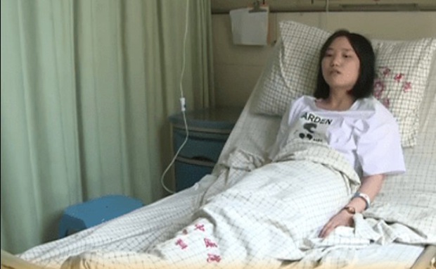 Cô bạn Vương Thiên nằm trên giường bệnh chuẩn bị cho cuộc giải phẫu cắt khối u.